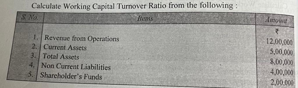 Cost of goods sold working capital D. None of the above. Revenue from Operations Working Capital Workig capital turnover ratio Revenue from Operations Working Capital.
